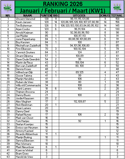 Dé plek in de Liemers waar darten, gezelligheid en sportiviteit samenkomen! Bij ons draait alles om plezier, saamhorigheid en respect. Of je nu komt voor de ranking, competitie, M.I.M.O., toernooien of het huren van een dartbaan: wij zorgen voor de perfecte dartbeleving.
